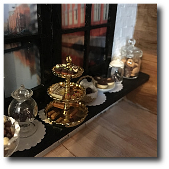 Januar 2017: Bei nächster Gelegenheit erstehe ich dann eine Ladentheke von Mini Mundus. Jetzt kommen die Leckereien besser zur Geltung und ich schaffe noch etwas Platz. Bei der Wand mit dem Fenster habe ich mich erstmals mit "Backsteinen" versucht und diese aus Eierkartons ausgeschnitten, aufgeklebt und dann gestrichen. Gar nicht mal so schlecht. Mein Café befindet sich übrigens in Hamburg - wie man beim Blick aus dem Schaufenster vielleicht erkennen kann.