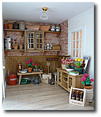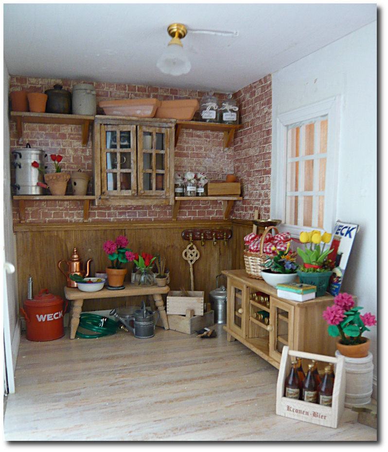 Mit den Arbeiten beginne ich rechts in der urspr�nglichen Speisekammer. Den Raum m�chte ich als eine Art "Hauswirtschaftsraum" nutzen. Zur Aufbewahrung der Blument�pfe, des Einkochapparates etc. Habe noch "Steintapete", die ich f�r die Stirnwand nutze und noch mit Holzvert�felung erg�nze. Arrangiere dann den Vitrinenschrank und die Regale neu. Das Waschbecken lasse ich auch erst einmal weg. Das Ergebnis finde ich schon mal ganz okay.