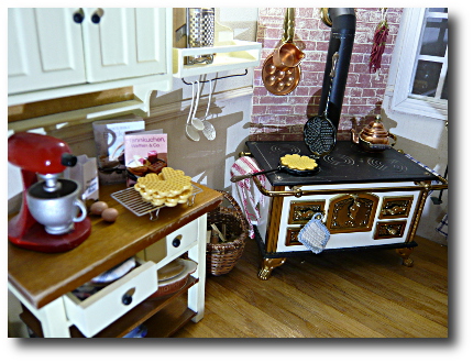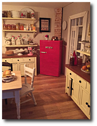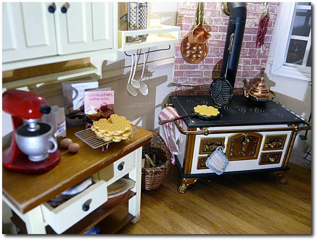 Dann widme ich mich der K�che. Zuerst entferne ich die Tapete und trimme den Fu�boden mit Schleifpapier hier und da etwas auf alt. Habe noch "Steintapete" �brig, die ich als Herd-Wand-Hintergrund verwende. "Echte" Ziegelsteine w�rden mir zwar besser gefallen, aber dazu fehlt mir derzeit noch entsprechendes Material. Habe zwar noch Ziegel, die reichen aber nicht. Und so verwende ich die Steine zur Gestaltung des Eingangsbereichs im Untergeschoss. Zwei K�chenw�nde tapeziere ich mit alt-wei�er Tapete und eine Wand mit einer grau-braunen Tapete. Ich entschlie�e mich auch zu einer neuen K�chenlampe.