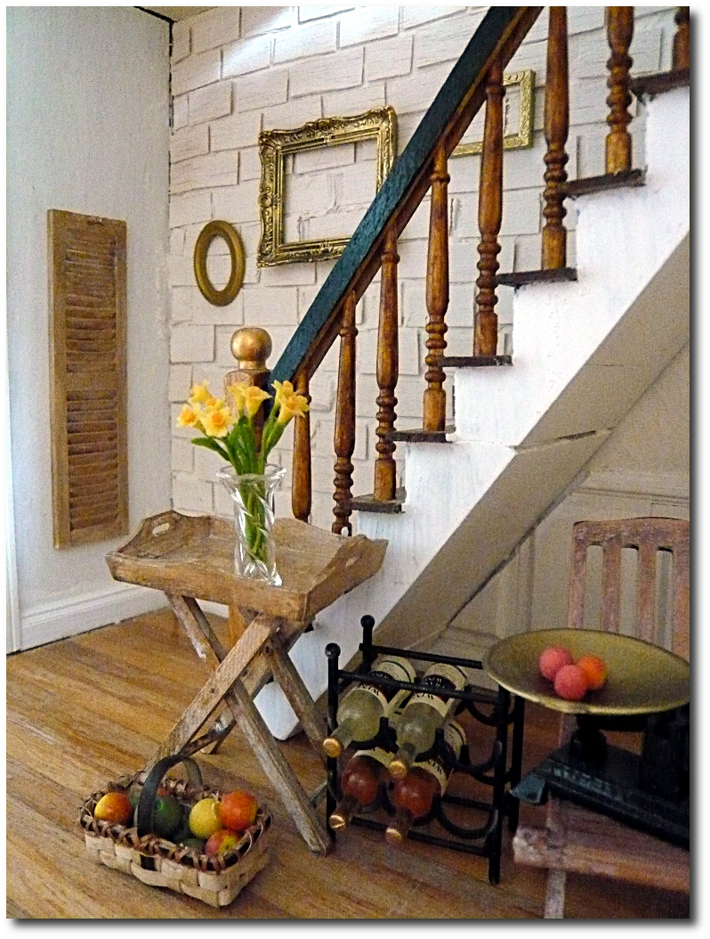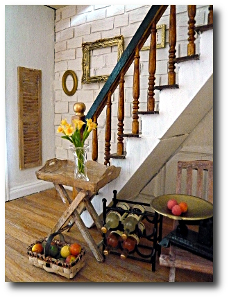 Parallel arbeite ich noch am Eingangsbereich im Erdgeschoss. Auch hier schleife ich etwas vom Glanz des Fu�bodens ab. Die Tapete entferne ich mehr oder weniger gut und streiche alles wei�. Den Treppenaufgang gestalte ich mit hellen "Steinen". Ich h�nge zwei Fensterl�den sowie Bilder bzw. Bilderrahmen, einen Spiegel und Garderobenhaken auf. Gef�llt mir gut.